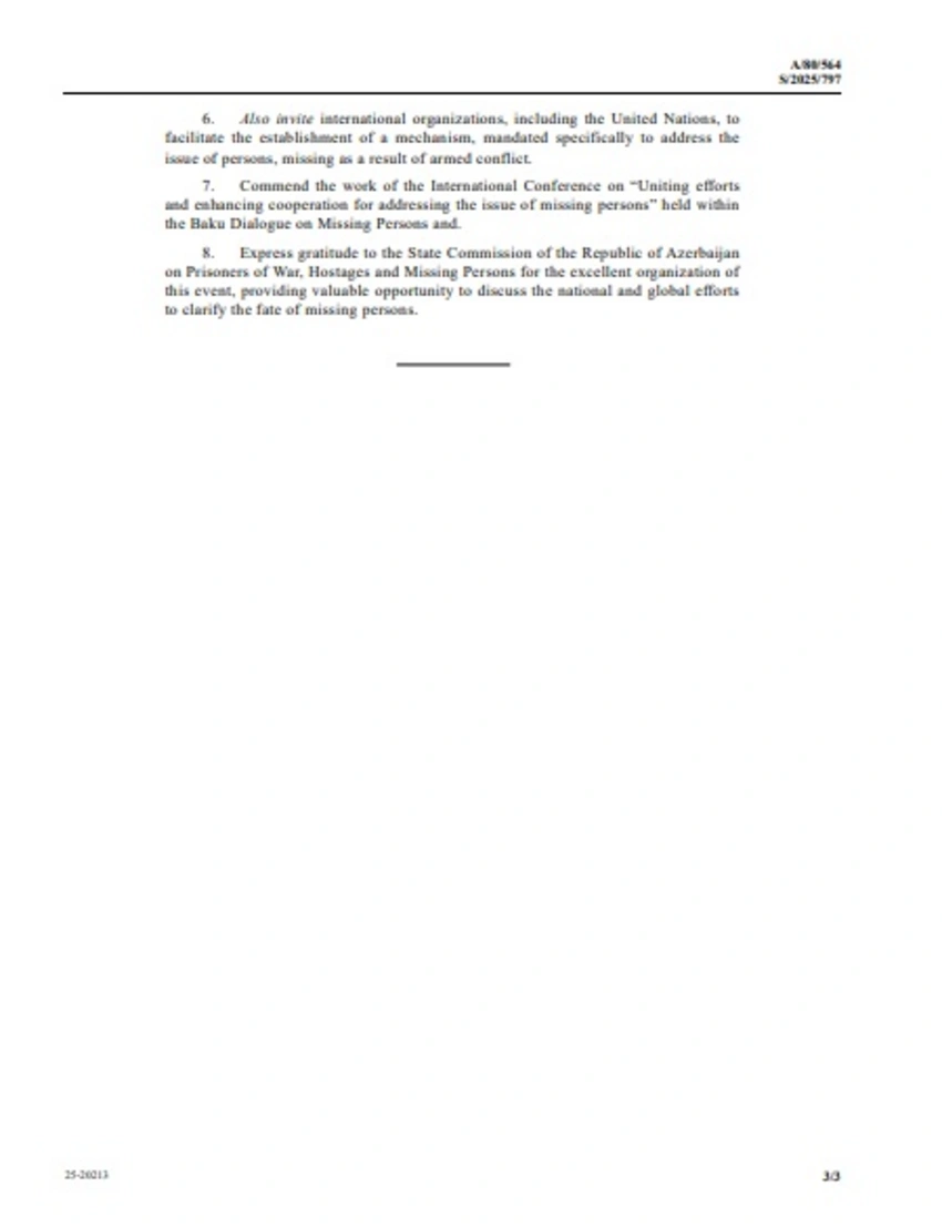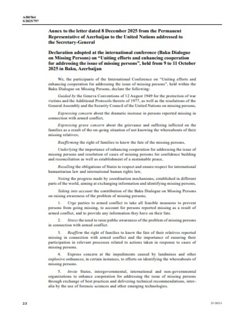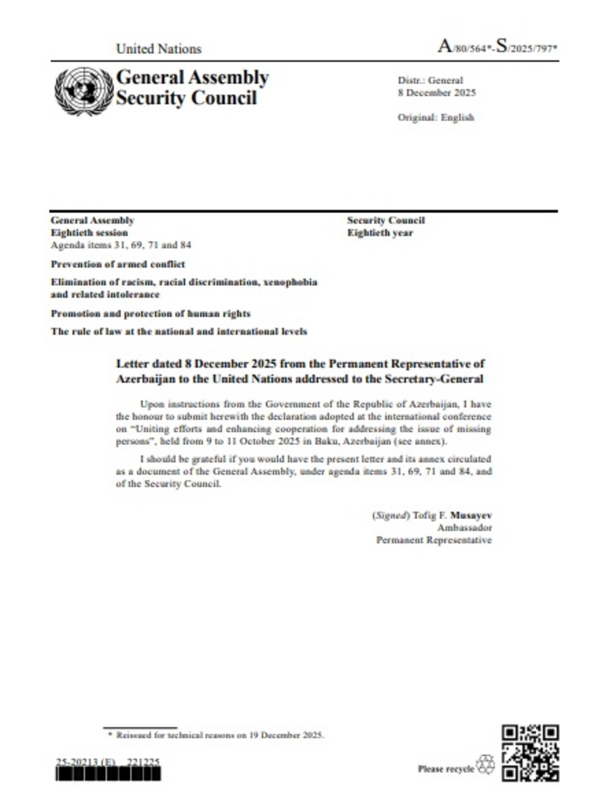 Как сообщает американское бюро Report, согласно документу, 8 декабря 2025 года Постоянный представитель Азербайджана при ООН Тофик Мусаев направил письмо Генеральному секретарю ООН с презентацией декларации, принятой на международной конференции в Баку, посвященной объединению усилий и усилению сотрудничества для решения проблемы пропавших без вести.