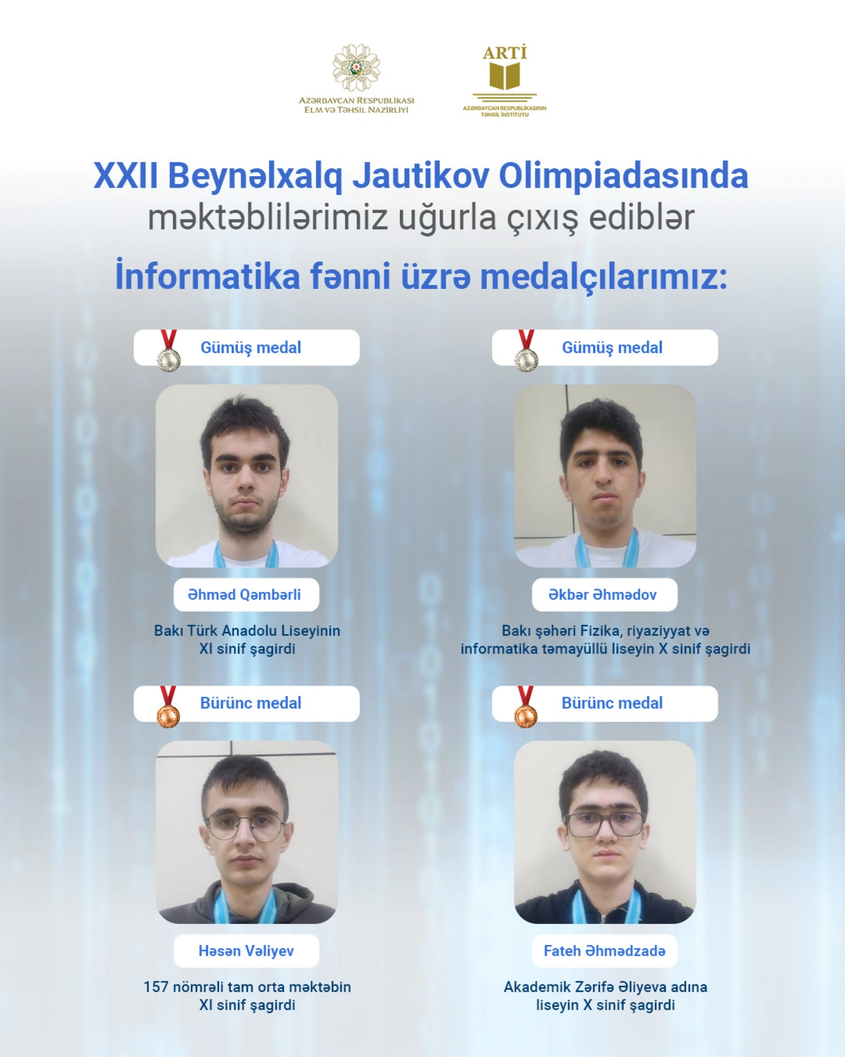 По информатике серебряных медалей были удостоены ученик XI класса Бакинского турецкого анатолийского лицея Ахмед Гамбарли и ученик X класса лицея с уклоном физики, математики и информатики города Баку Акпер Ахмедов, а бронзовых медалей — ученик XI класса средней школы №157 Гасан Велиев и ученик X класса лицея имени академика Зарифы Алиевой Фатех Ахмедзаде.