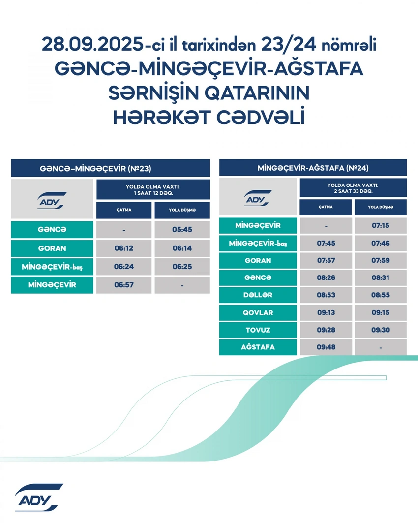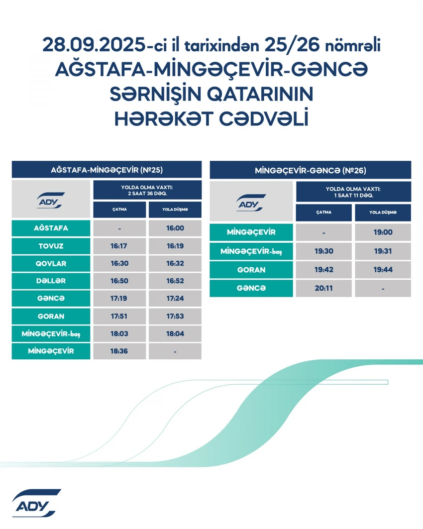 Как сообщили Report в АЖД, в преддверии 145-летия железных дорог Азербайджана — с 28 сентября 2025 года дважды в день по маршруту Гянджа-Мингячевир-Агстафа начнут курсировать современные электропоезда.