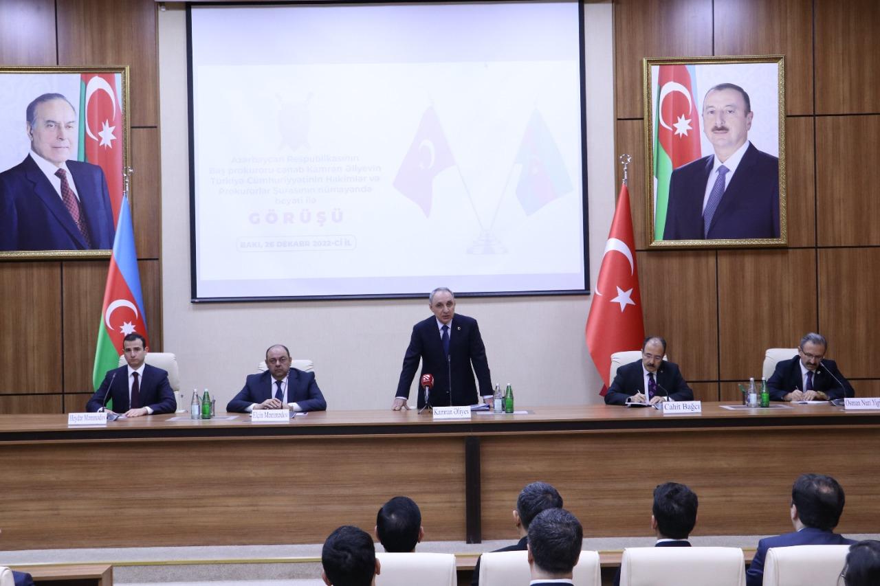 Затем состоялась встреча в Генпрокуратуре Азербайджанской Республики. В ходе встречи было особо отмечено, что развитие отношений дружбы и сотрудничества между странами поднялось до уровня стратегического партнерства, двусторонние отношения успешно развиваются по многим направлениям благодаря совместным усилиям и непоколебимой политической воле президентов Ильхама Алиева и Реджепа Тайипа Эрдогана.