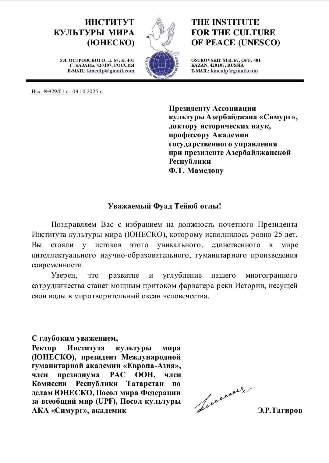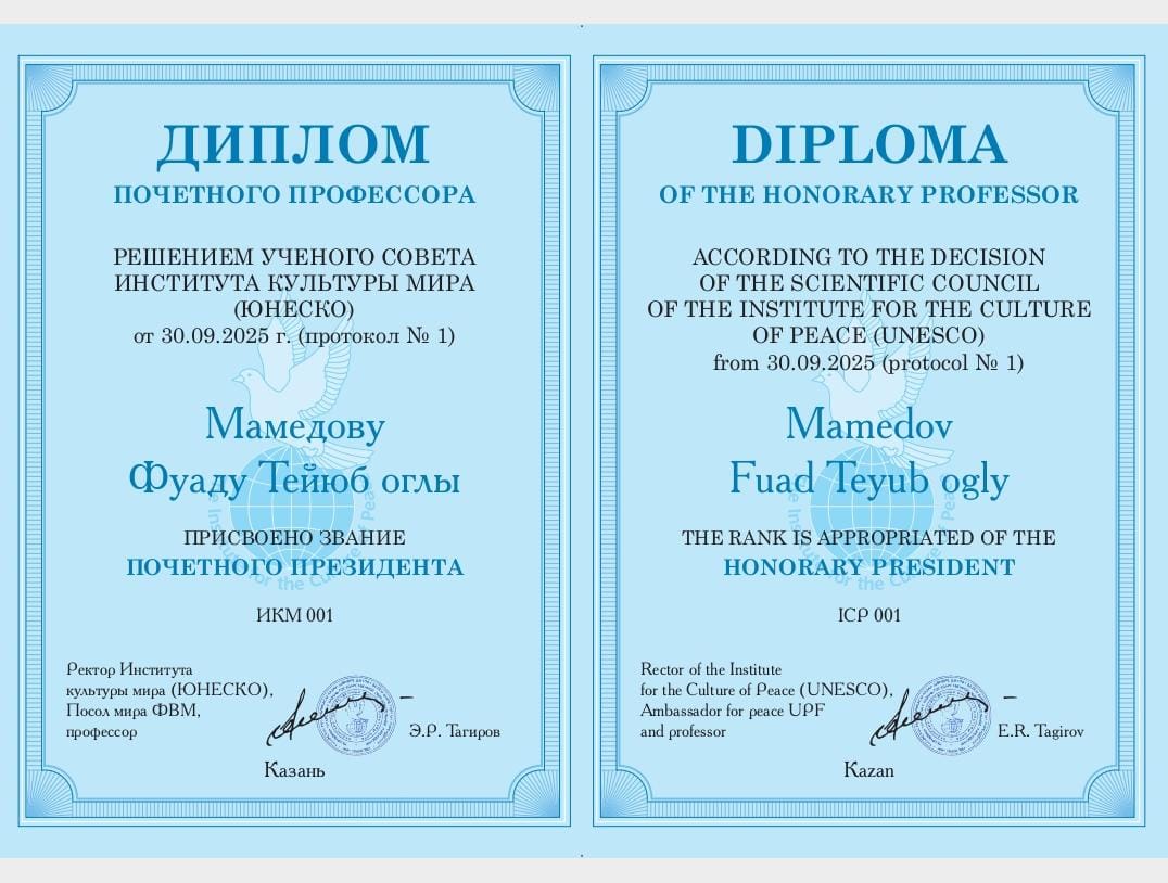 Фуад Мамедов стал почетным президентом Института культуры мира ЮНЕСКО