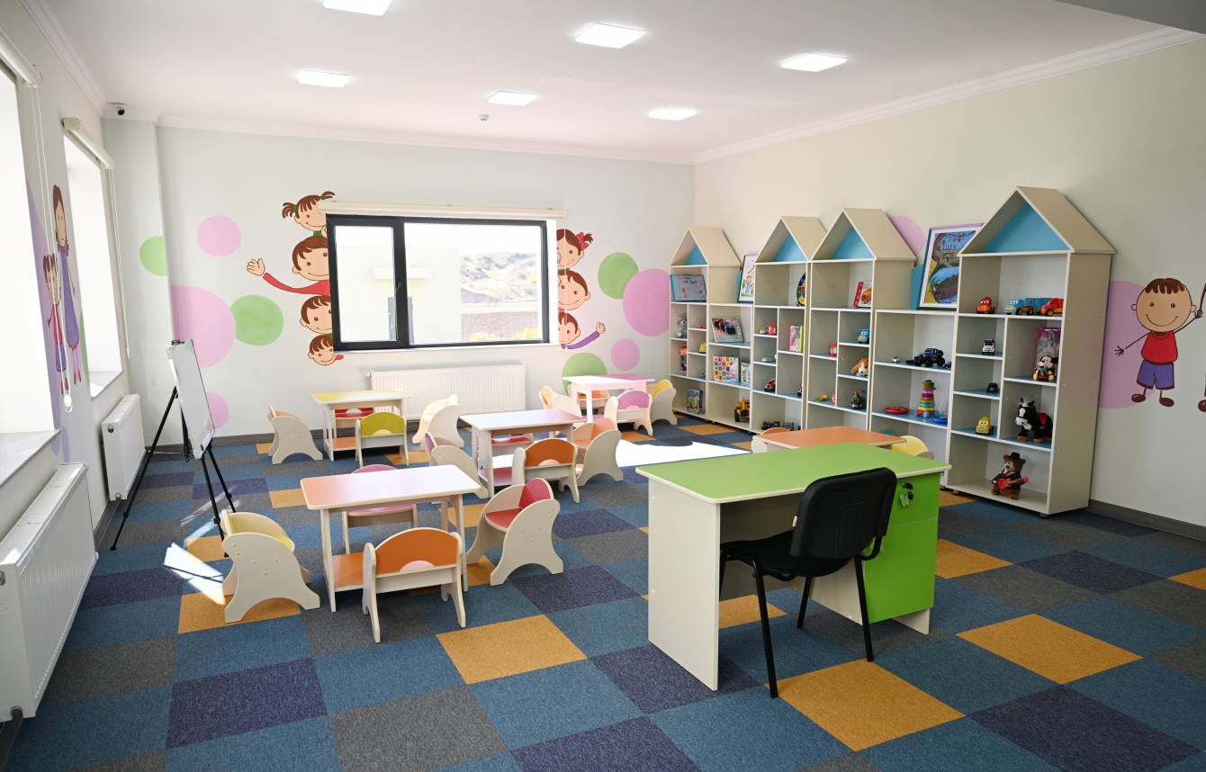 В построенном селе яслях-детском саду особое внимание уделено обеспечению комфортных условий для детей. В детском саду в распоряжение детей будут переданы столовая, игровая и музыкальная комнаты. Кроме того, в здании имеются административный, компьютерный и методический кабинеты. Также созданы условия для интересного проведения детьми своего досуга.
