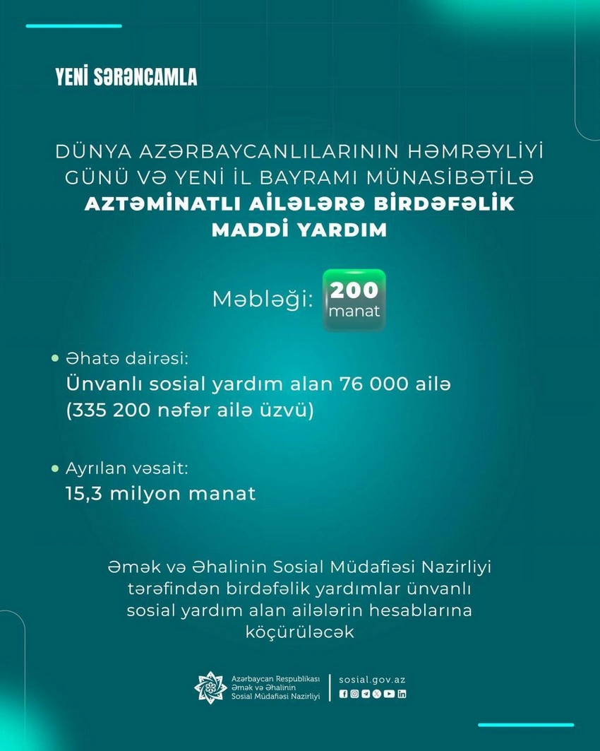 Напомним, согласно распоряжению, в связи с Днем солидарности азербайджанцев мира и Новым годом каждой семье, получающей по состоянию на 30 декабря 2025 года адресную соцпомощь, будет выплачено по 200 манатов. На реализацию данной меры из государственного бюджета выделено 15,3 млн манатов.