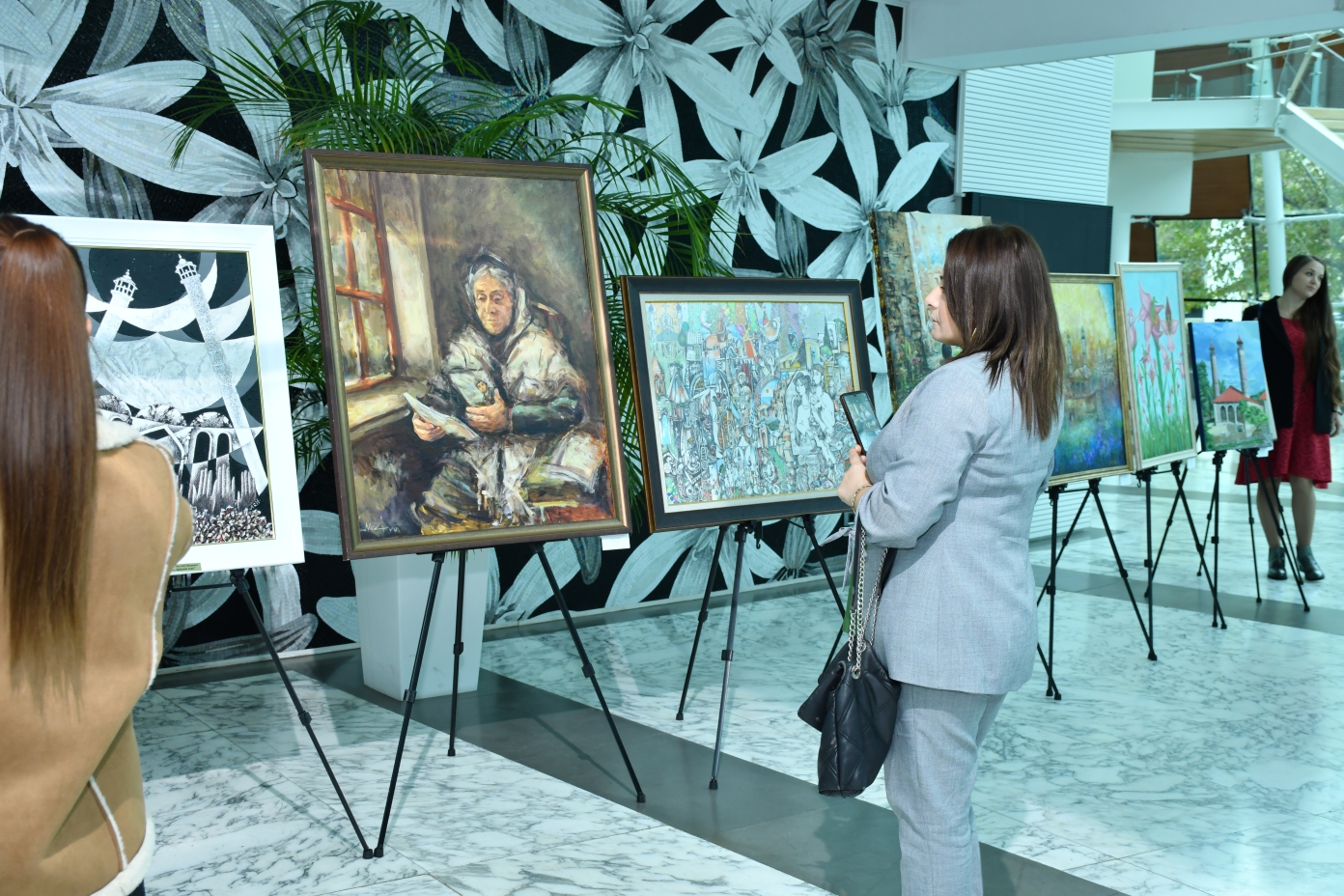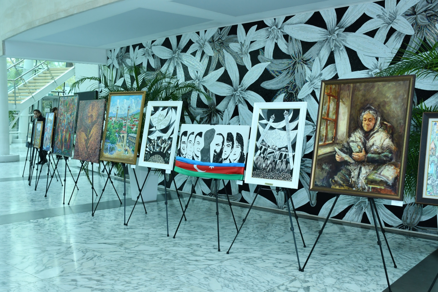 Сначала гости познакомились с художественной выставкой, организованной Государственной художественной галереей к 5-летию Победы. В экспозицию вошло 21 произведение в жанрах графики, живописи и плаката известных азербайджанских художников — Арифа Гусейнова, Мир Азера Абдуллаева, Тахира Ширалиева, Назима Мамедова, а также нескольких молодых авторов.