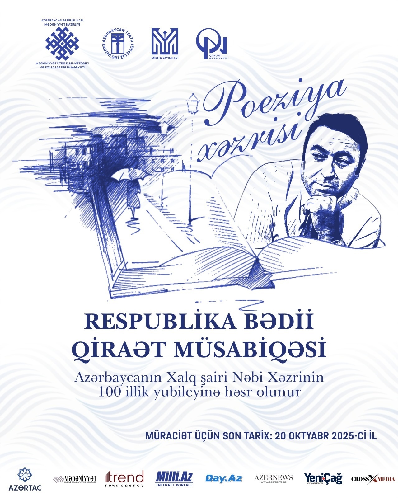Министерство культуры при поддержке Научно-методического и квалификационного центра культуры (МЕМИМ), организационной поддержке Союза театральных деятелей Азербайджана и партнерстве издательства «Ганун» и издательства «МИМТА», объявляет республиканский конкурс художественного чтения «Поэзия Хазри», посвященный 100-летию Наби Хазри.