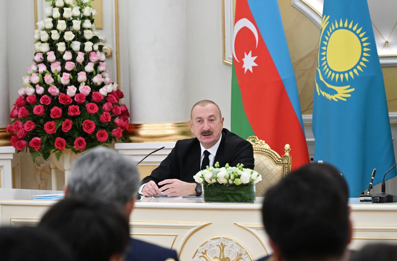 Прежде всего, выражаю искреннюю признательность уважаемому Президенту Ильхаму Гейдар оглу Алиеву за то, что принял мое приглашение и посетил Казахстан с государственным визитом.