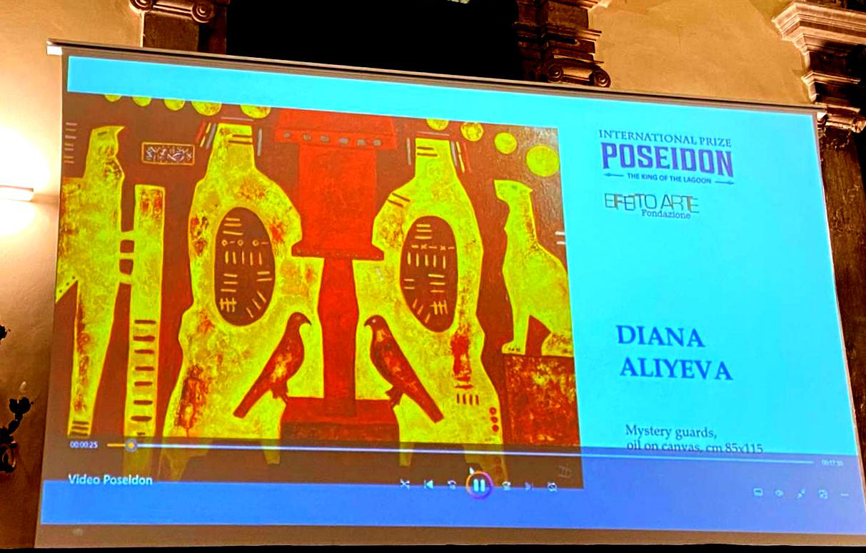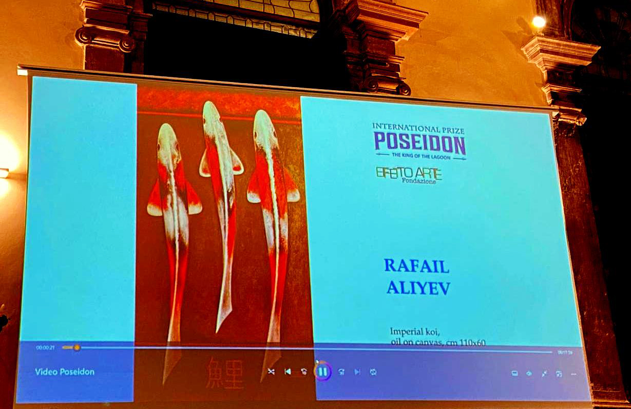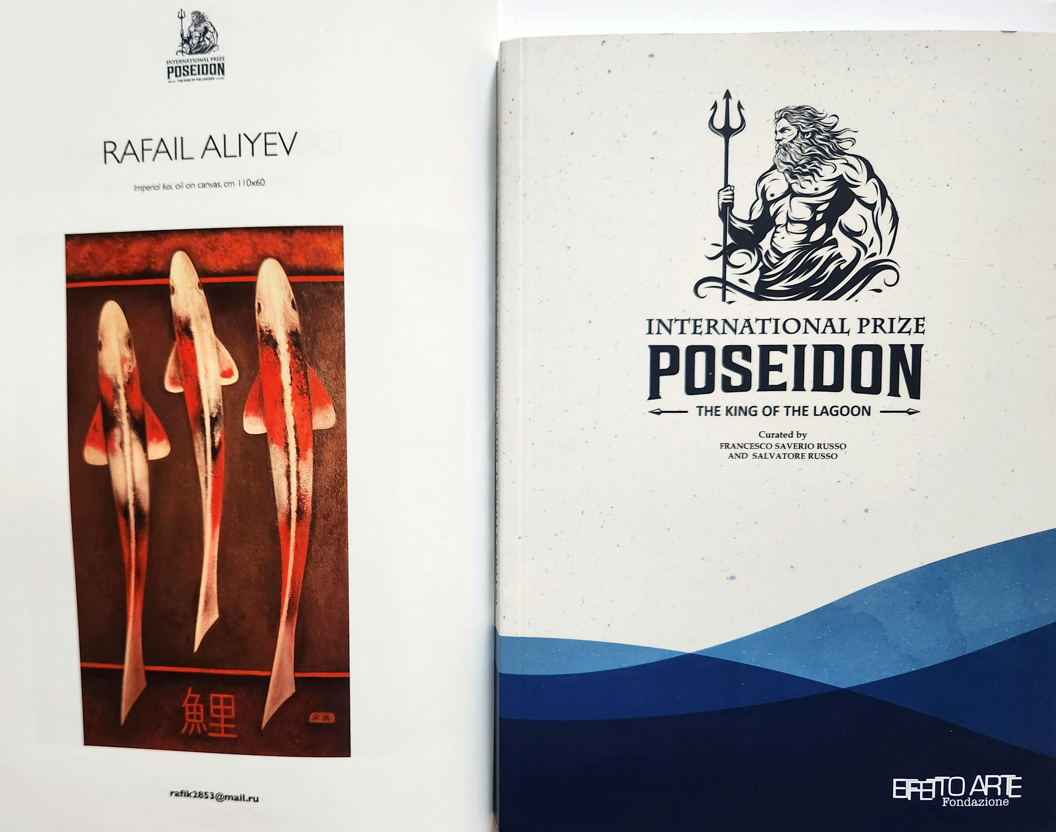 «Мне и Диане пришло очередное приглашение для участия в международном конкурсе на соискание престижной международной премии «Посейдон — король Лагуны», который традиционно проходит в Венеции, Италия. Премия, курируемая братьями Руссо (Сальваторе и Франческо Саверио) и продвигаемая Фондом Effetto Arte, отмечает художников, скульпторов, цифровых художников и присуждается в области искусства. Ранней осенью каждый из нас отправил организаторам фотографии творческих работ (ред. Рафаил Алиев – «Королевские кои», Диана Алиева – «Хранители тайны») на соискание данной премии.