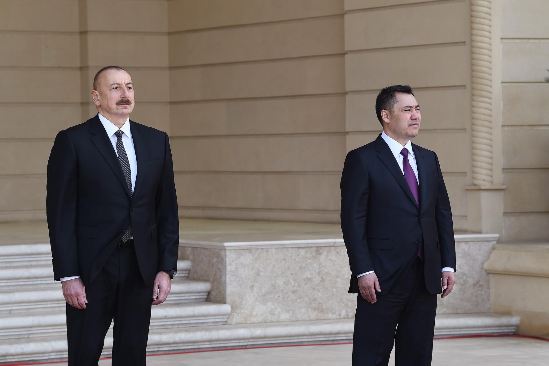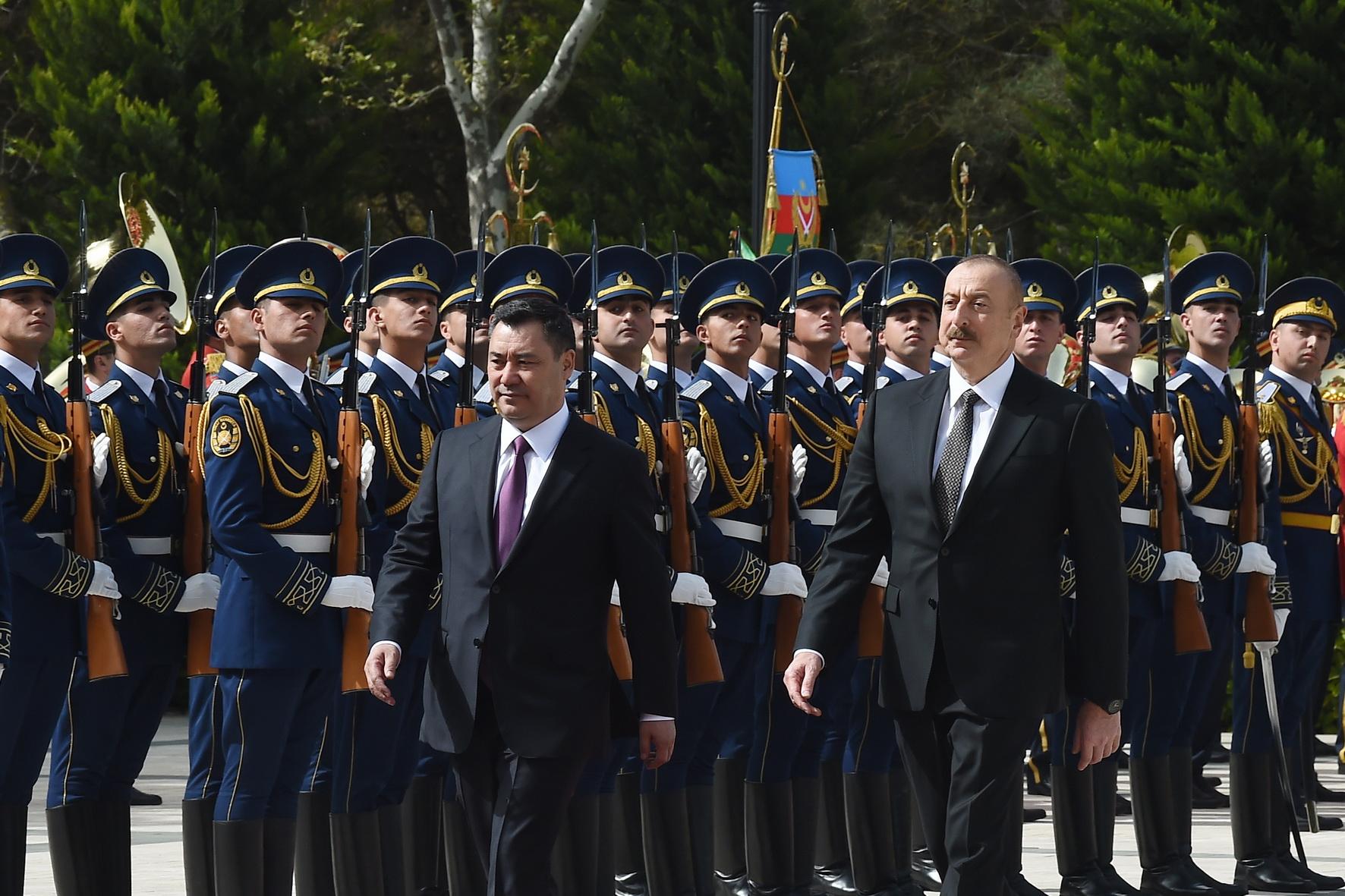 Президент Ильхам Алиев и президент Садыр Жапаров обошли строй почетного караула.