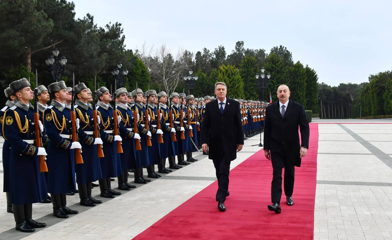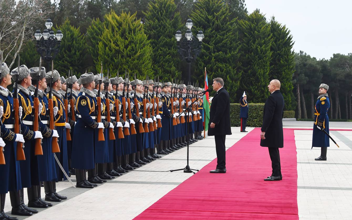 Под звуки военного марша почетный караул прошел перед Президентом Азербайджана Ильхамом Алиевым и Президентом Румынии Клаусом Йоханнисом.