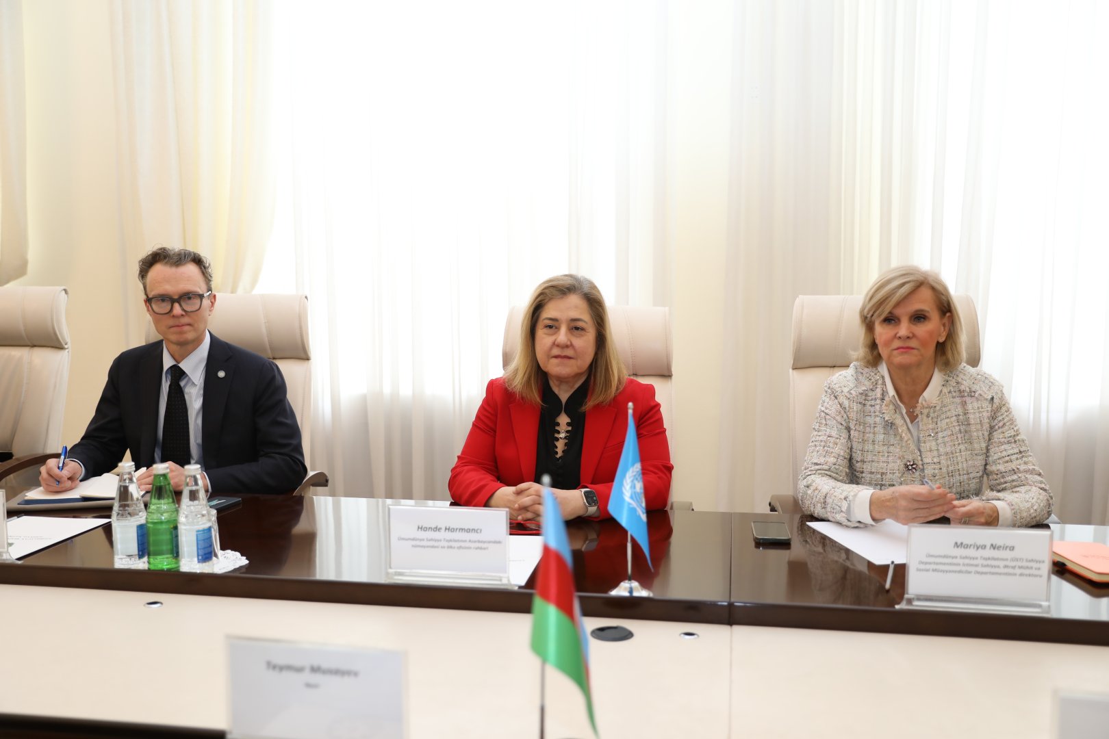 В министерстве здравоохранения Азербайджанской Республики состоялась встреча министра Теймура Мусаева с должностными лицами Всемирной организации здравоохранения (ВОЗ) — директором Департамента общественного здравоохранения, окружающей среды и социальных детерминантов здоровья Марией Нейрой и директором Департамента инфекционных болезней, окружающей среды и здоровья Европейского регионального бюро ВОЗ Роббом Батлером, входящими в переговорную группу COP29.