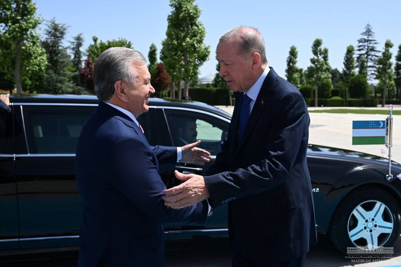 В честь высокого гостя выстроился почетный караул. Президенты Шавкат Мирзиёев и Реджеп Тайип Эрдоган поднялись на подиум. Прозвучали государственные гимны Узбекистана и Турции. Лидеры двух стран обошли строй почетного караула.
