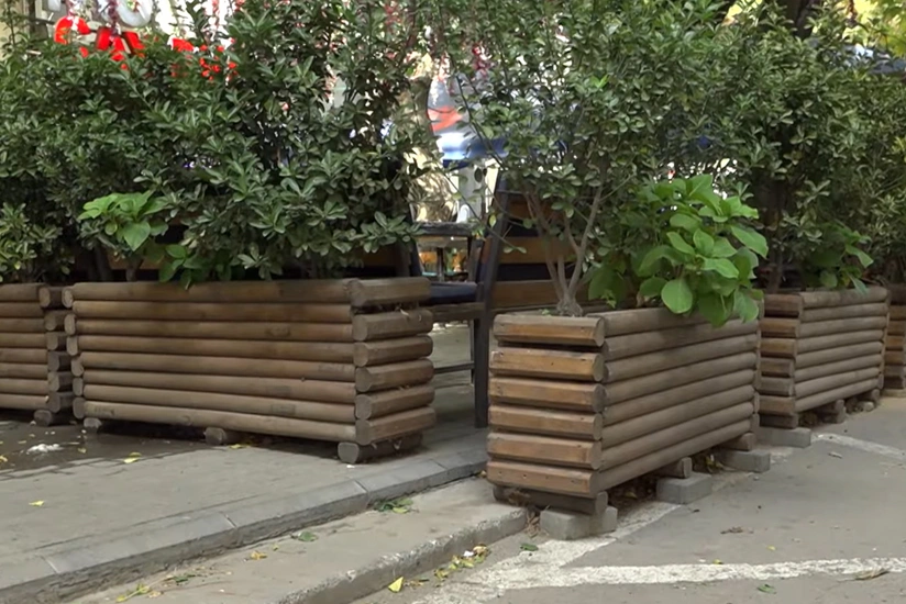 Перед объектами общественного питания были установлены кашпо и навесы, занимавшие часть тротуара.