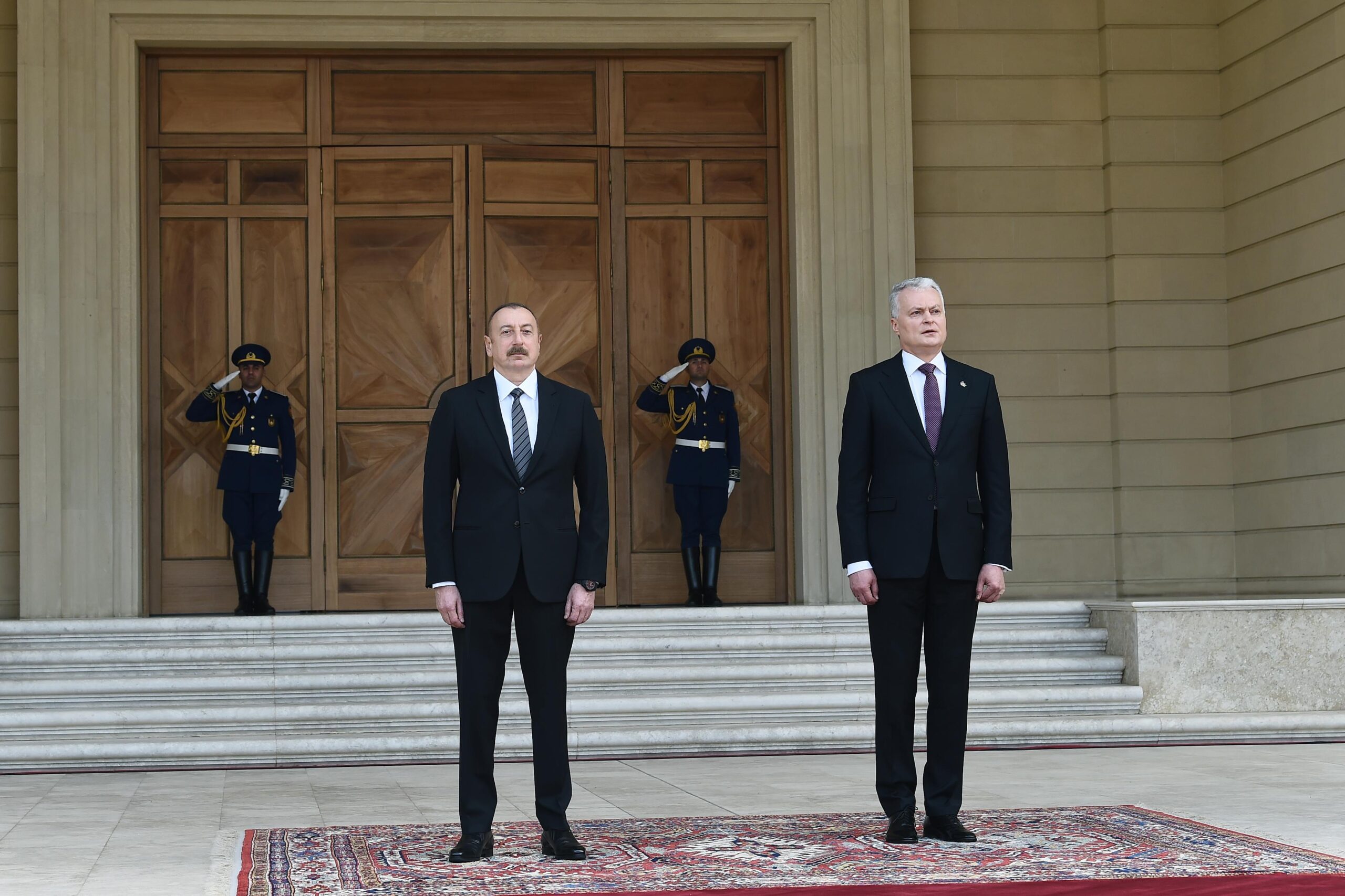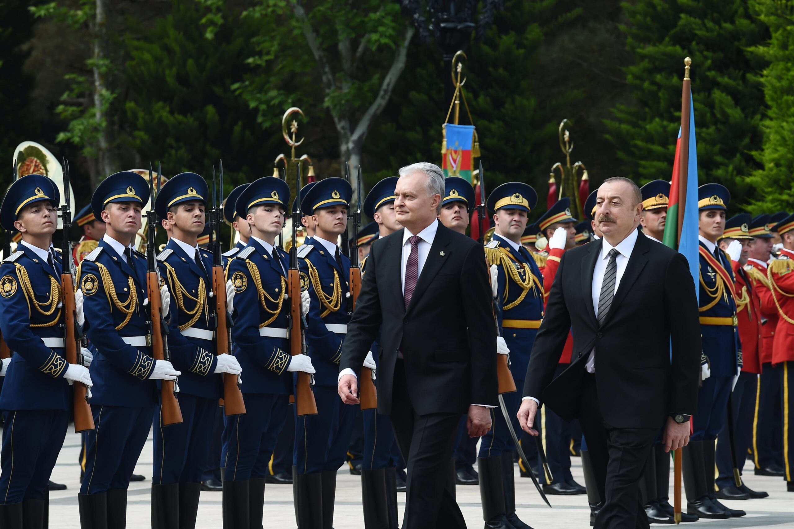 Под звуки военного марша почетный караул прошел перед президентом Азербайджана Ильхамом Алиевым и президентом Литвы Гитанасом Науседой.