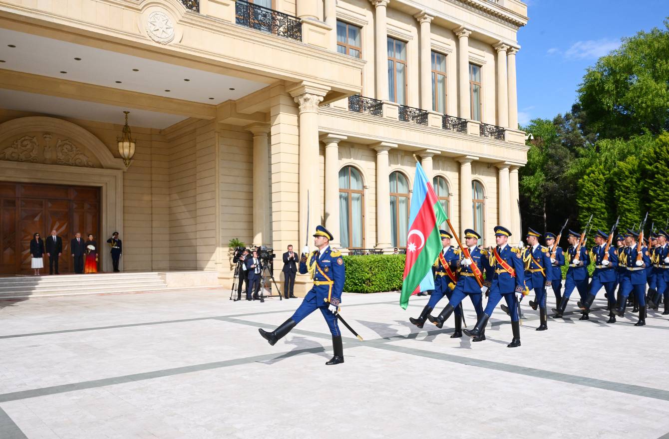 Под звуки военного марша почетный караул прошел перед Президентом Азербайджана Ильхамом Алиевым и Генеральным секретарем Центрального Комитета Коммунистической партии Социалистической Республики Вьетнам То Ламом.