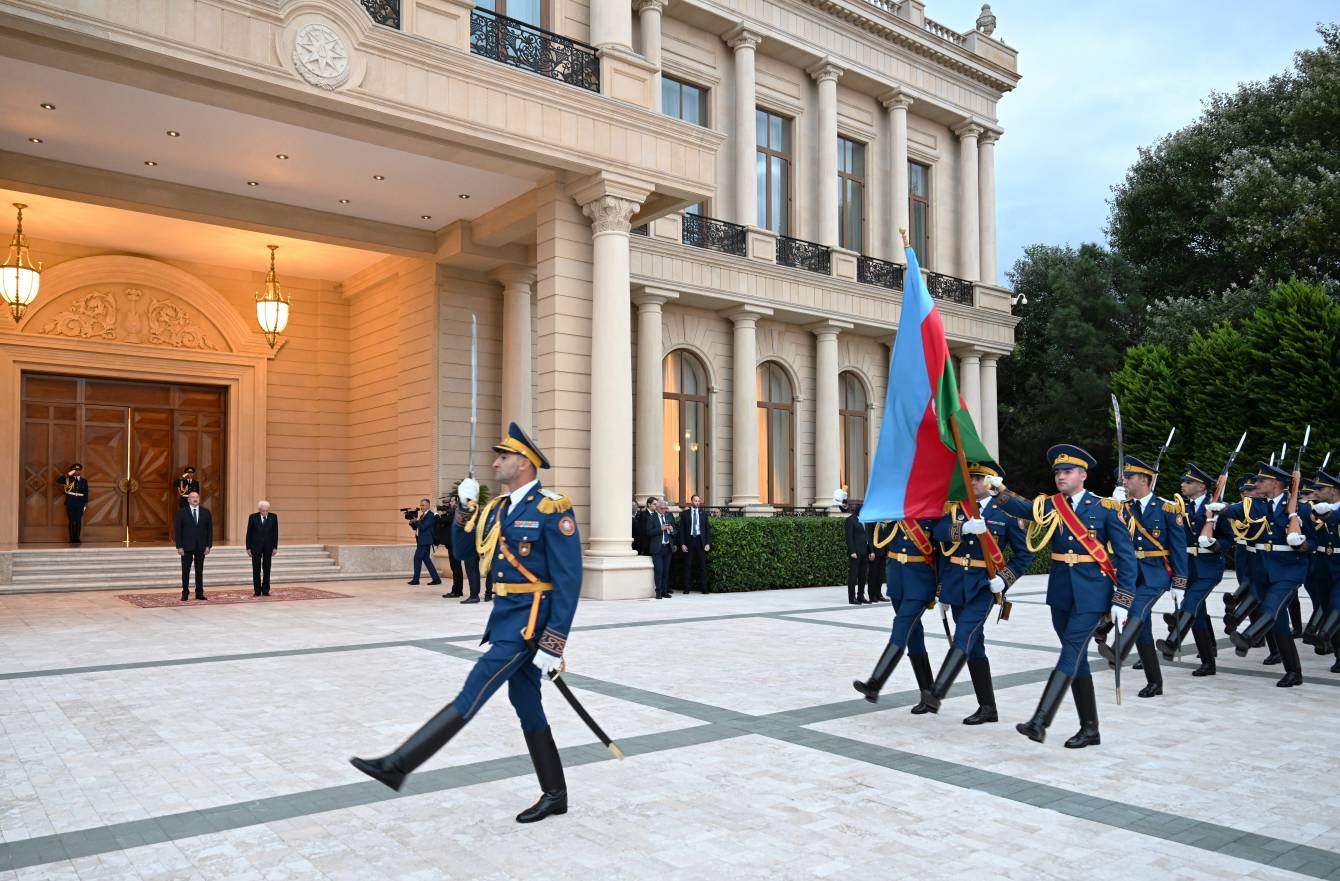 Под звуки военного марша почетный караул прошел перед Президентом Азербайджана Ильхамом Алиевым и Президентом Италии Серджо Маттареллой.