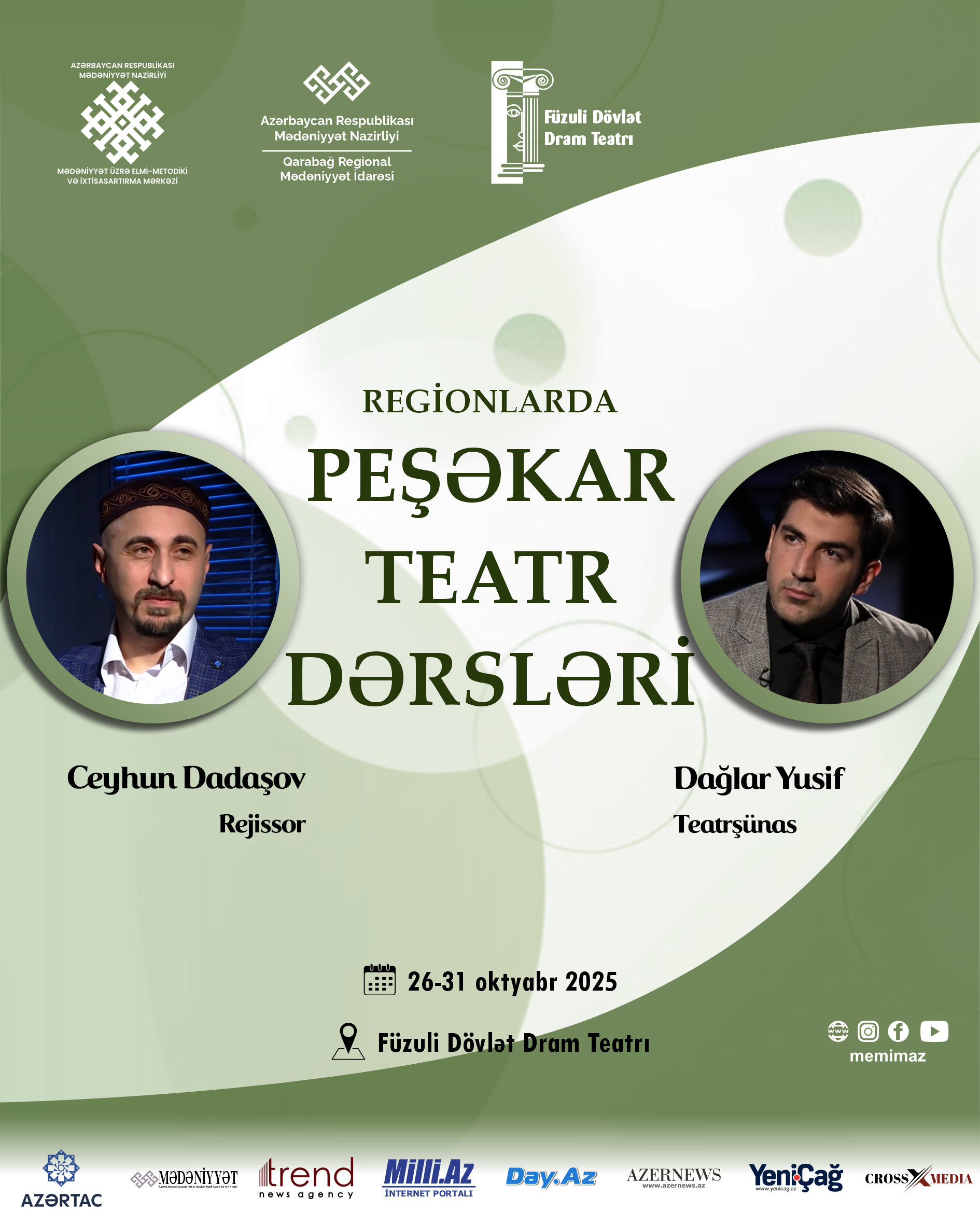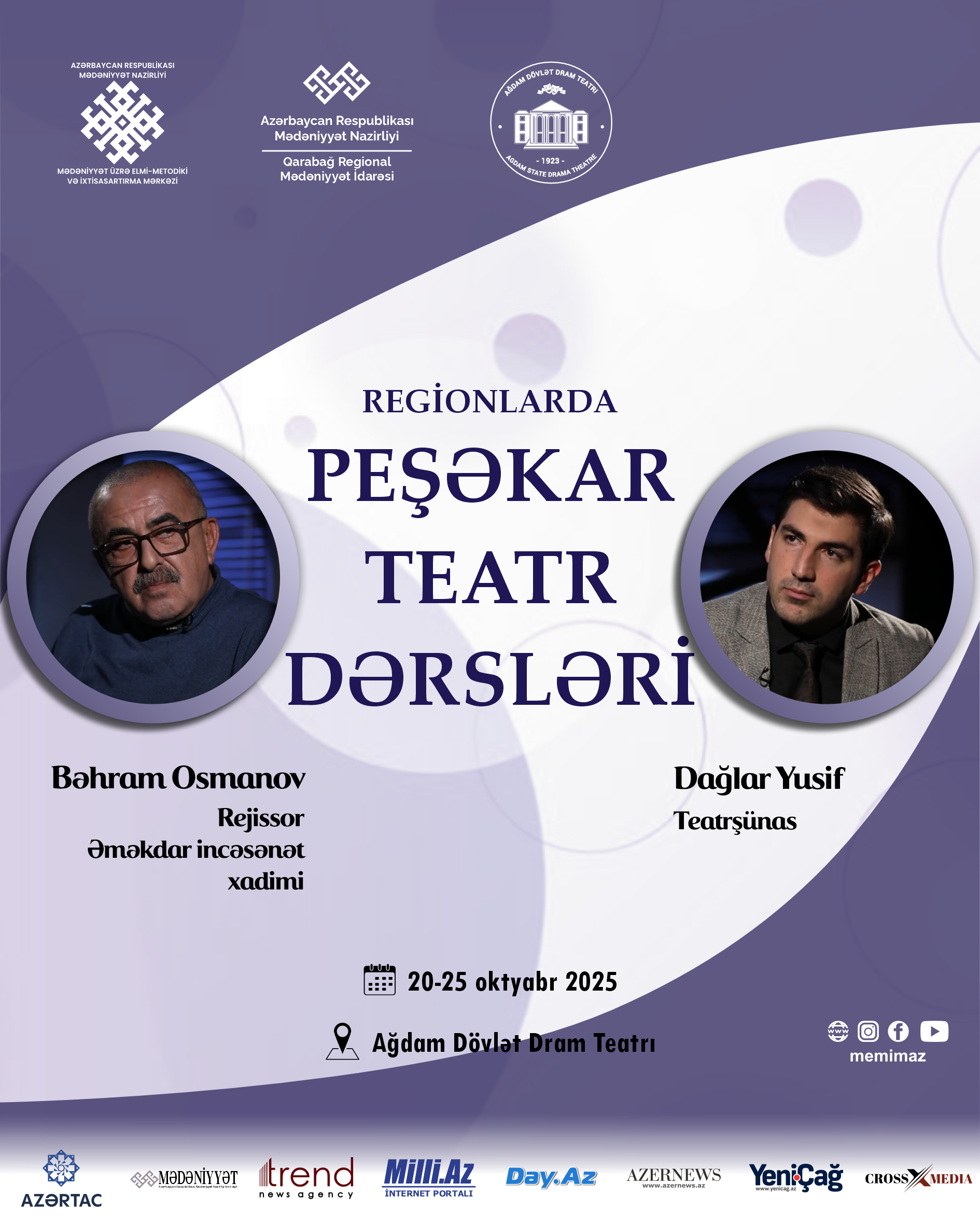 С 20 по 25 октября в Агдамском государственном драматическом театре и с 26 по 31 октября в Физулинском государственном драматическом театре пройдет цикл мероприятий под названием «Уроки профессионального театра в регионах».