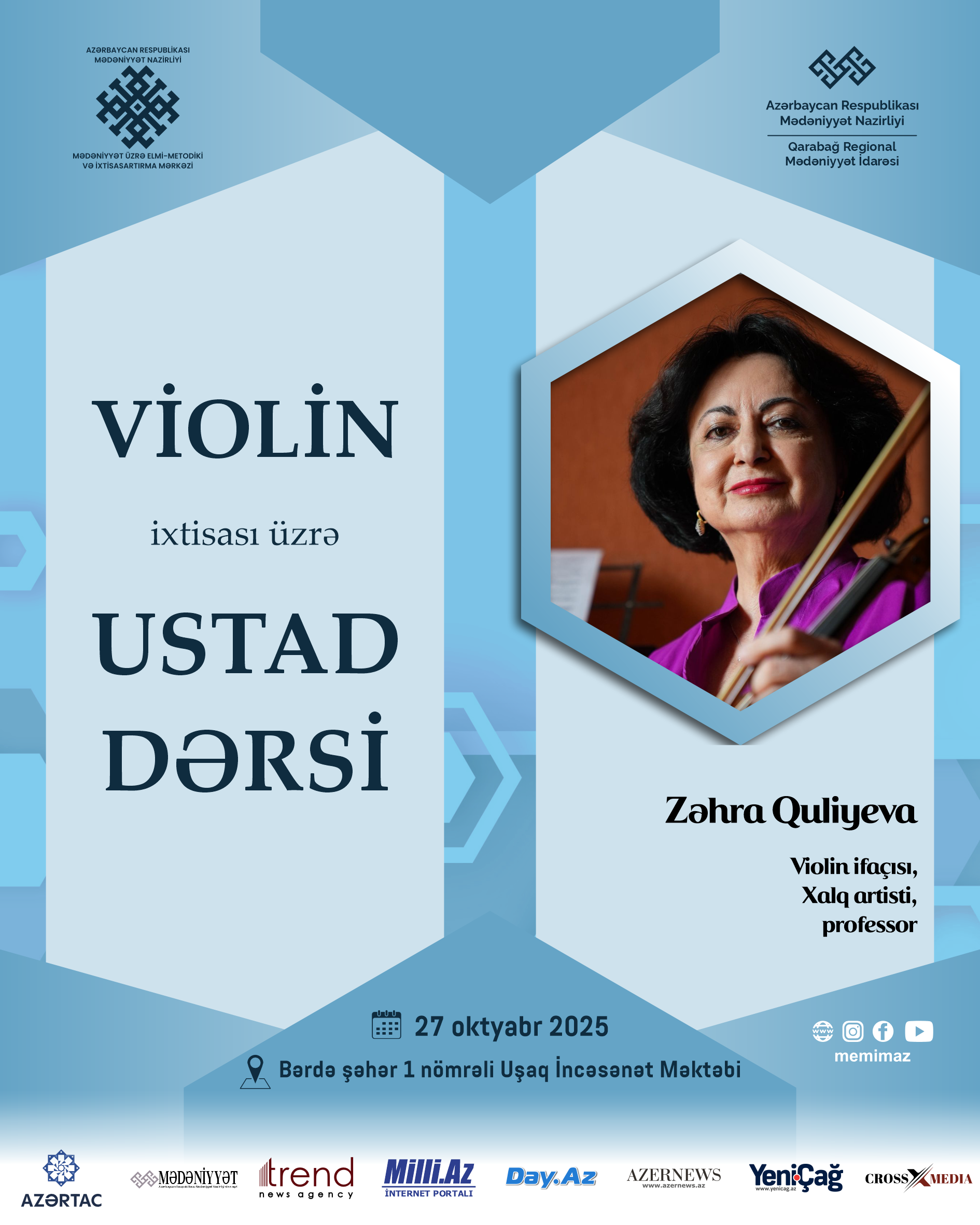 В рамках «Ветра культуры» также запланирован ряд мастер-классов. 27 октября в Детской школе искусств №1 города Барда пройдут мастер-классы по скрипке с участием народной артистки, профессора Захры Гулиевой.