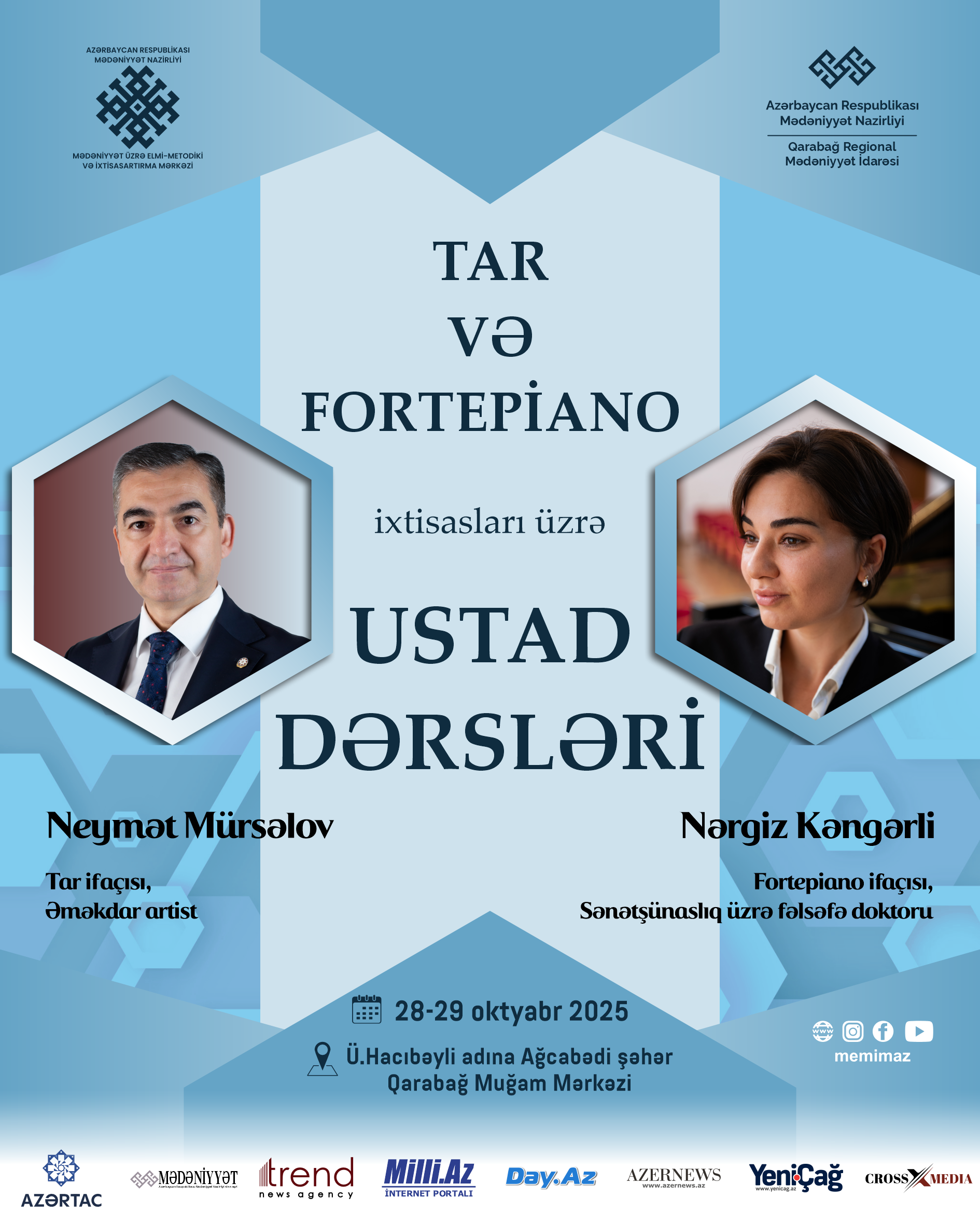 А также 28 октября Карабахском центре мугама имени Узеира Гаджибейли города Агджабеди — мастер-классы по тару с участием заслуженного артиста Неймата Мурсалова и по фортепиано – доктора искусствоведения Наргиз Кенгерли.