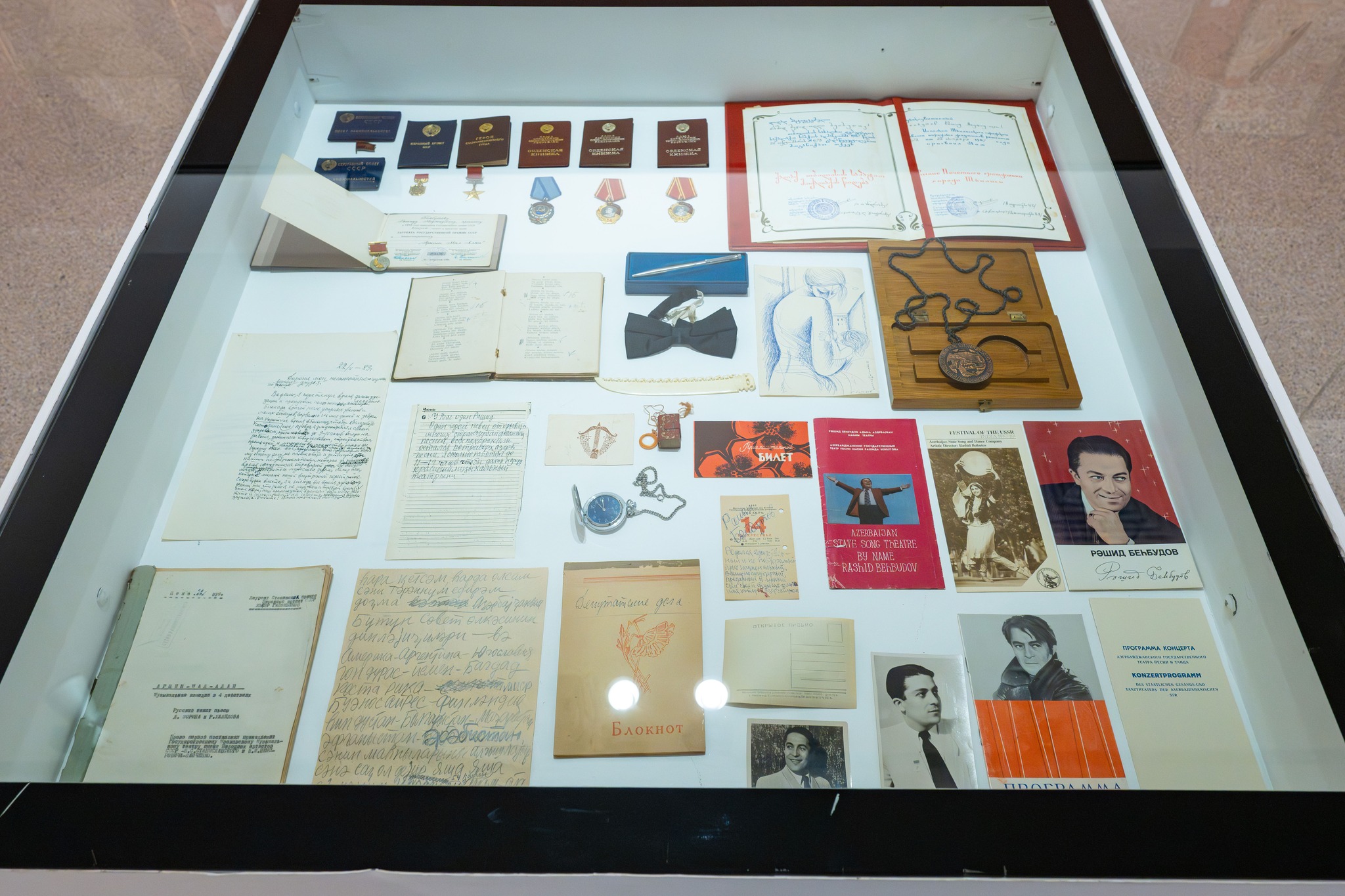 Представленные на выставке экспонаты освещают важные моменты богатой жизни и блестящего творческого пути Рашида Бейбутова. Помимо государственных наград и медалей, которыми был награжден певец, на выставке представлены карманный Коран, сценарий оперетты «Аршин мал алан», подготовленный для Московского театра в 1952 году, и записная книжка о парламентской деятельности Р.Бейбутова. Среди наиболее впечатляющих экспонатов выставки — последнее письмо автора, написанное в московской больнице в 1989 году, и рукопись бессмертной песни «Ey Vətən». Эти уникальные документы являются визуальным воплощением безграничной преданности Рашида Бейбутова своему искусству и своей Родине.