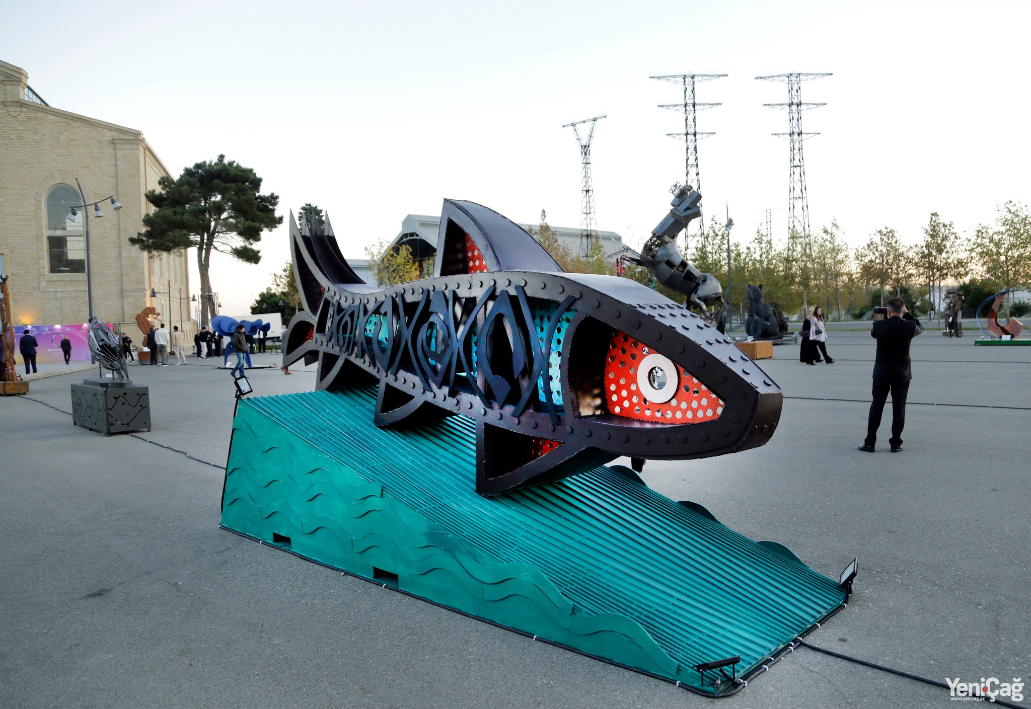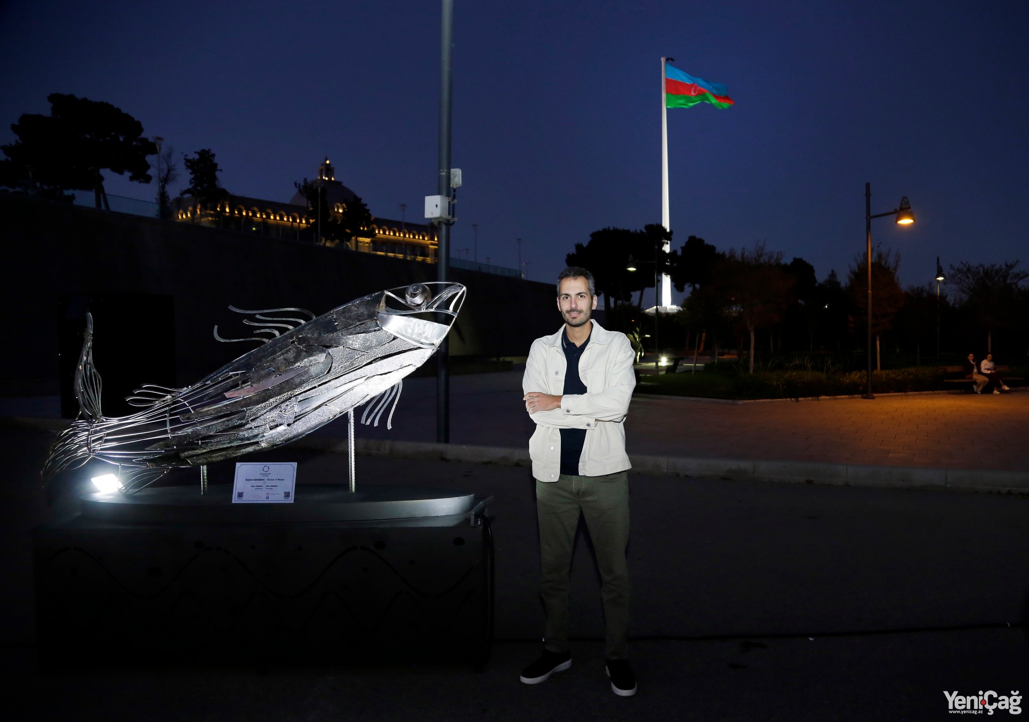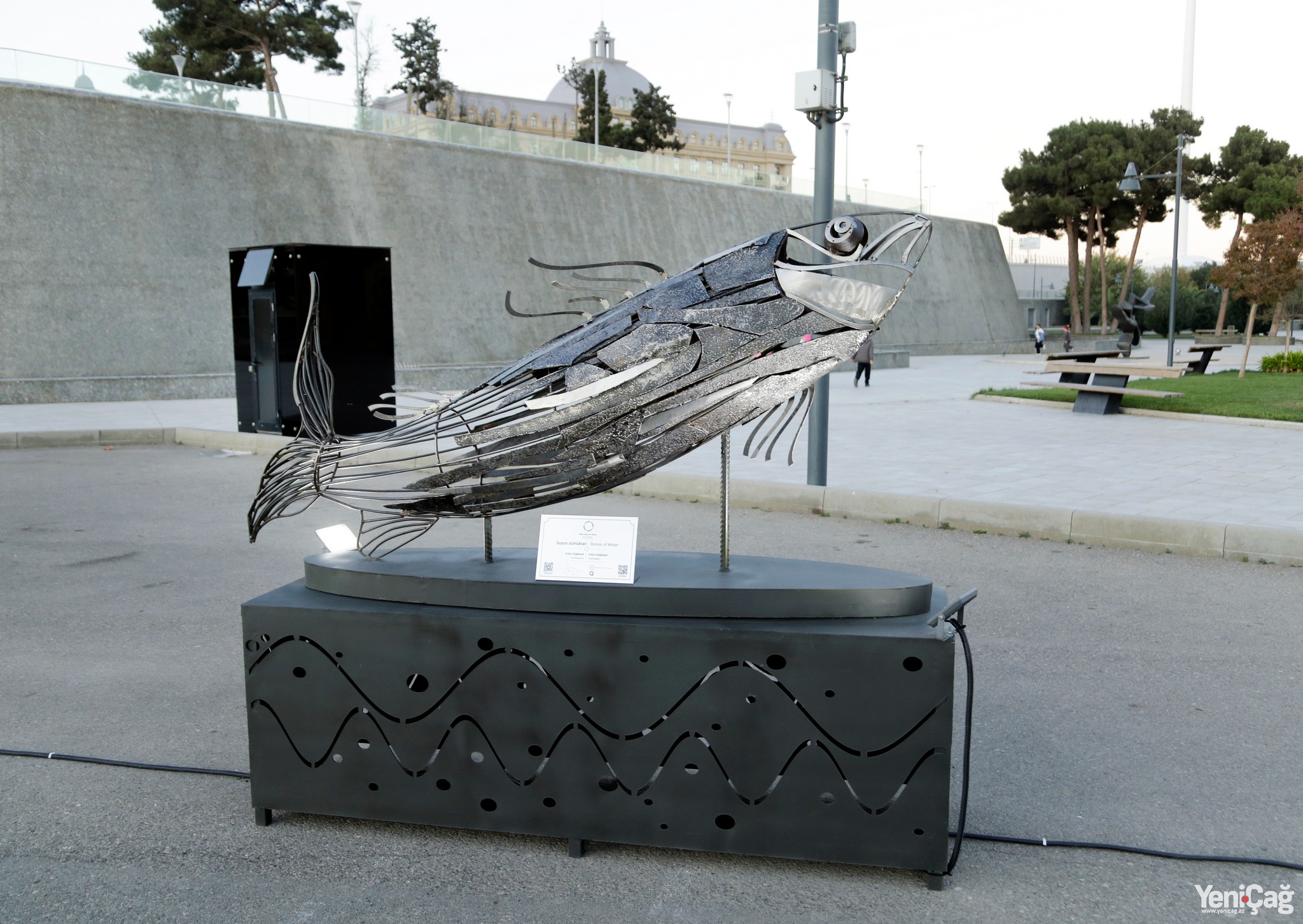 В своей металлической инсталляции азербайджанский художник Эркин Алекберли решил наглядно продемонстрировать, насколько пагубно может воздействовать загрязнение на подводный мир, флору и фауну океанов и морей. «Моя работа называется «Кости воды», концепция которой заключается в том, что загрязнение окружающей среды может привести к необратимым последствиям – полному вымиранию водных существ, в частности, рыб, от которых в итоге не останется даже костей, так как скелет тоже может раствориться. На визуальной стороне скульптуры можно заметить, как часть рыбы исчезает. В итоге это приведет к тому, что от рыбы останется только силуэт, который мы визуально запомнили. Одним словом, инсталляция призывает людей задуматься о решении экологических проблем, пока это еще не поздно», — почеркнул художник.