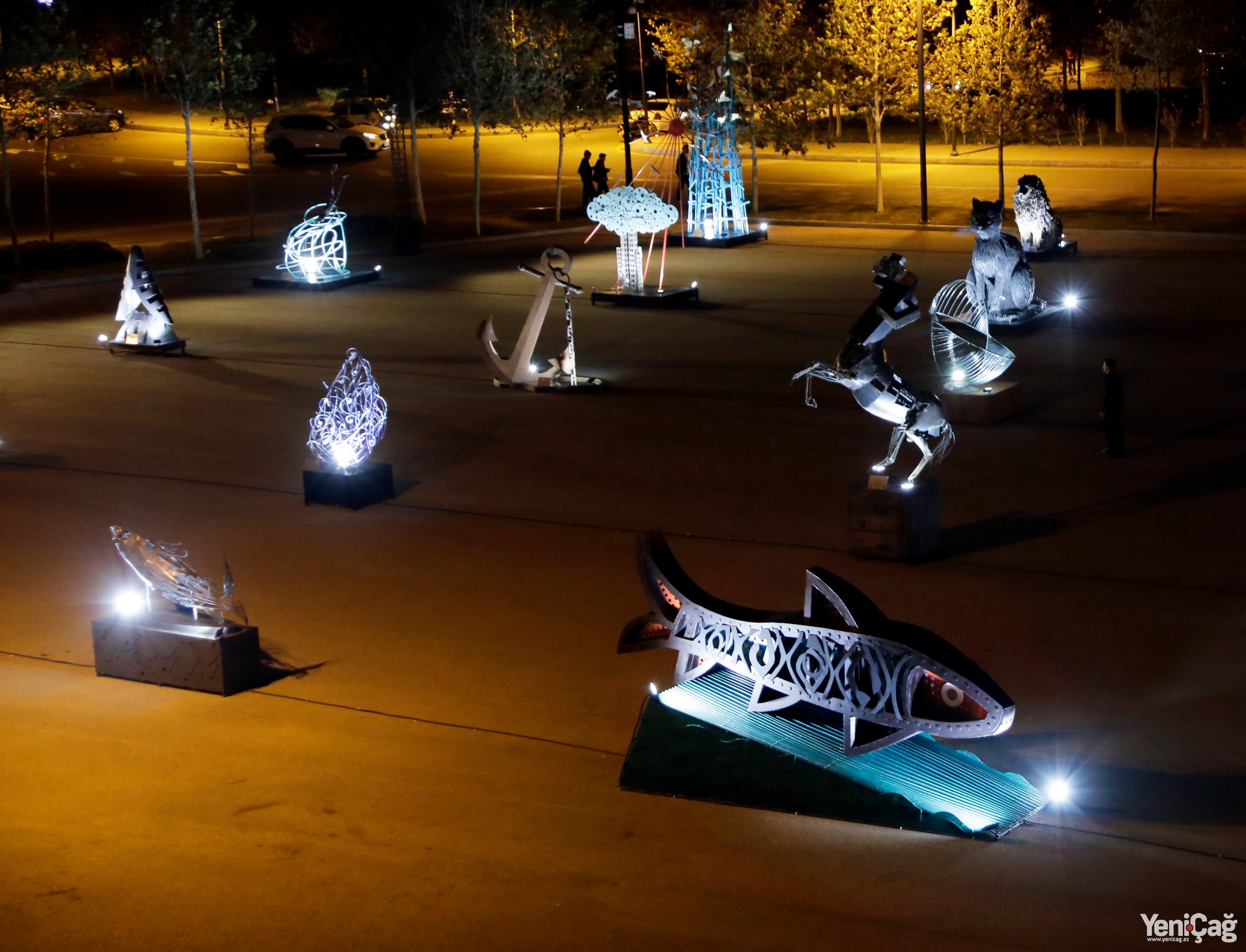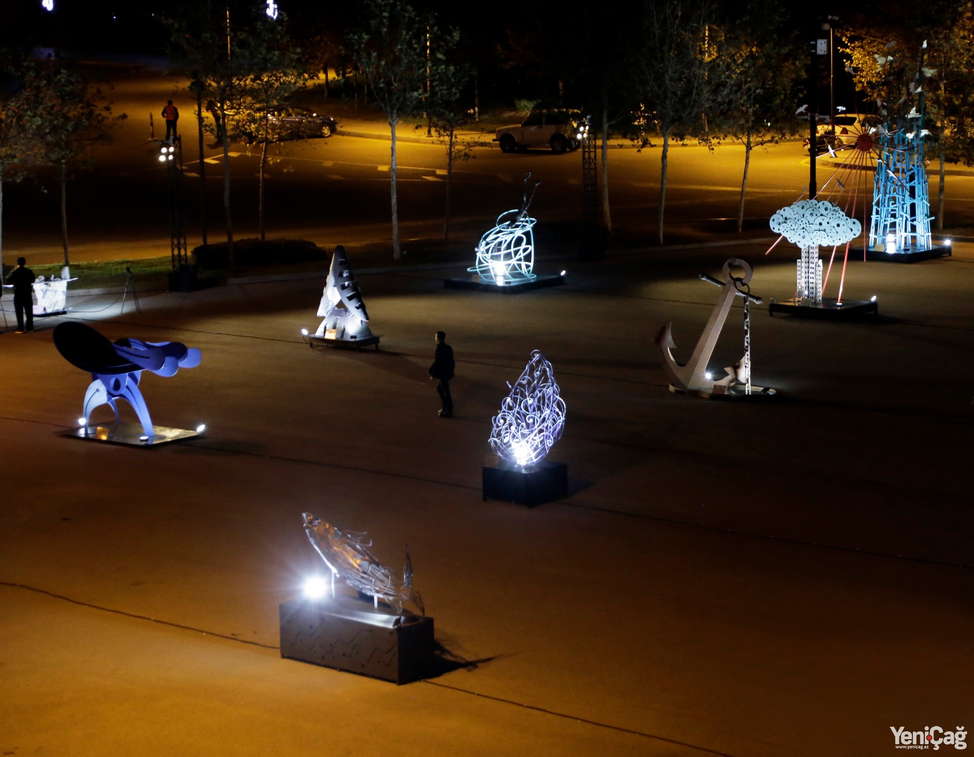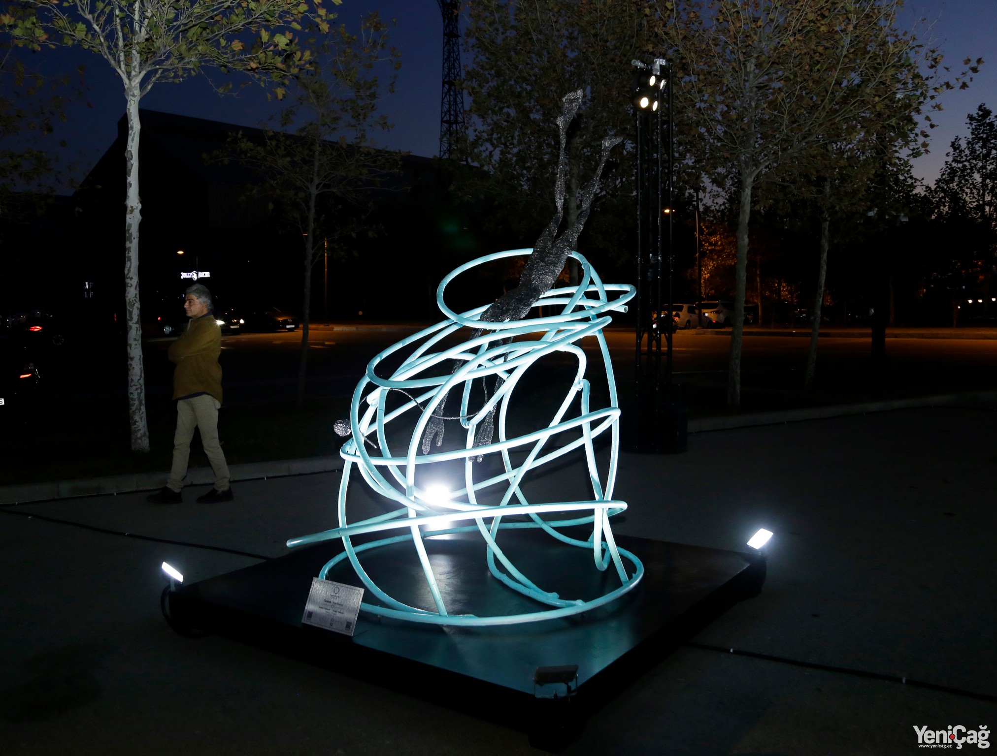 В своей металлической инсталляции азербайджанский художник Эркин Алекберли решил наглядно продемонстрировать, насколько пагубно может воздействовать загрязнение на подводный мир, флору и фауну океанов и морей. «Моя работа называется «Кости воды», концепция которой заключается в том, что загрязнение окружающей среды может привести к необратимым последствиям – полному вымиранию водных существ, в частности, рыб, от которых в итоге не останется даже костей, так как скелет тоже может раствориться. На визуальной стороне скульптуры можно заметить, как часть рыбы исчезает. В итоге это приведет к тому, что от рыбы останется только силуэт, который мы визуально запомнили. Одним словом, инсталляция призывает людей задуматься о решении экологических проблем, пока это еще не поздно», — почеркнул художник.