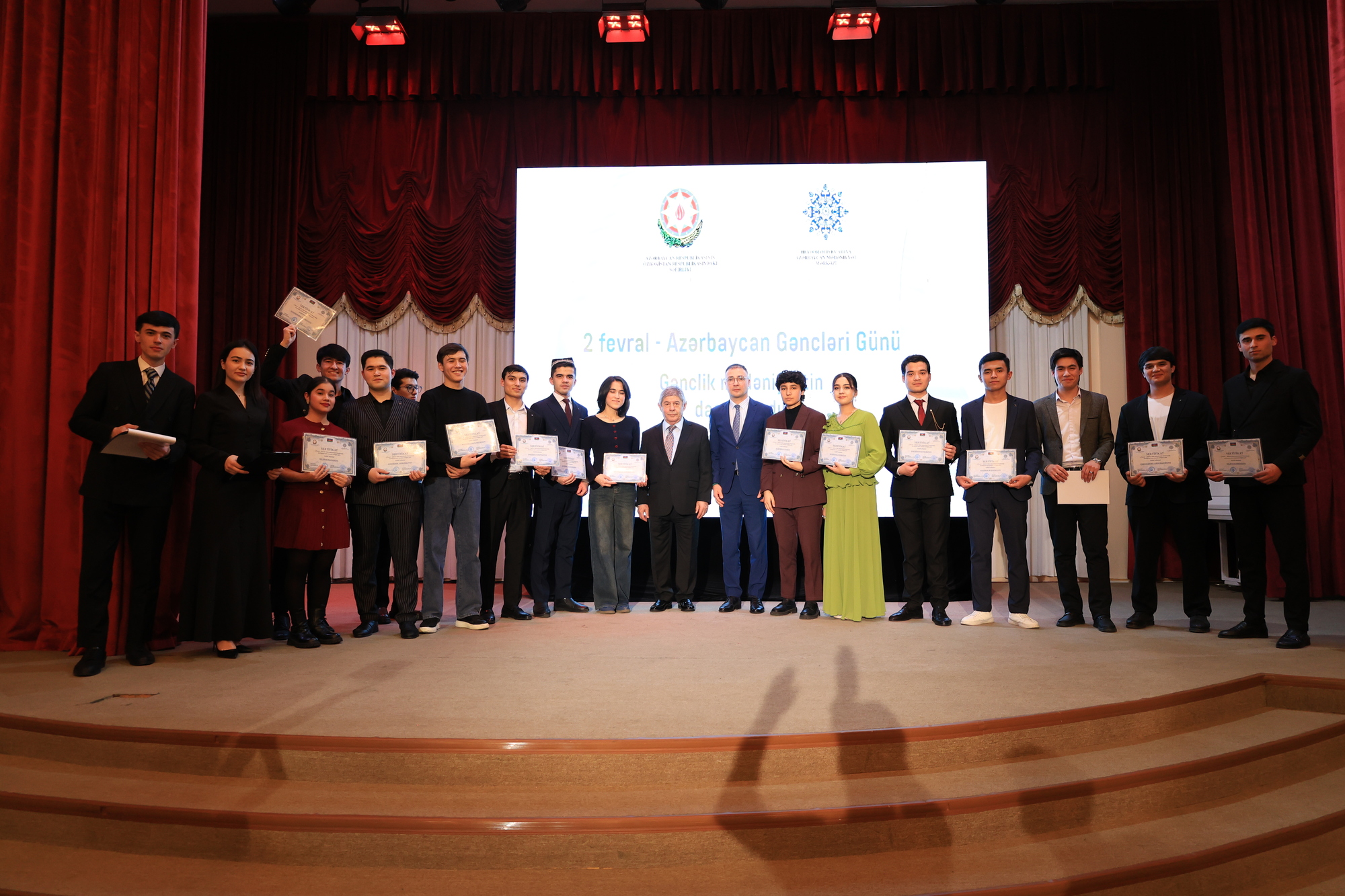 Чрезвычайный и полномочный посол Азербайджана в Узбекистане Гусейн Гулиев и директор Азербайджанского культурного центра имени Гейдара Алиева Акиф Марифли вручили сертификаты молодёжи и творческим коллективам, активно участвующим в популяризации азербайджанской культуры в Узбекистане, в том числе участникам танцевального ансамбля «Карабахская победа» и театральной труппы «Хары бюльбюль».