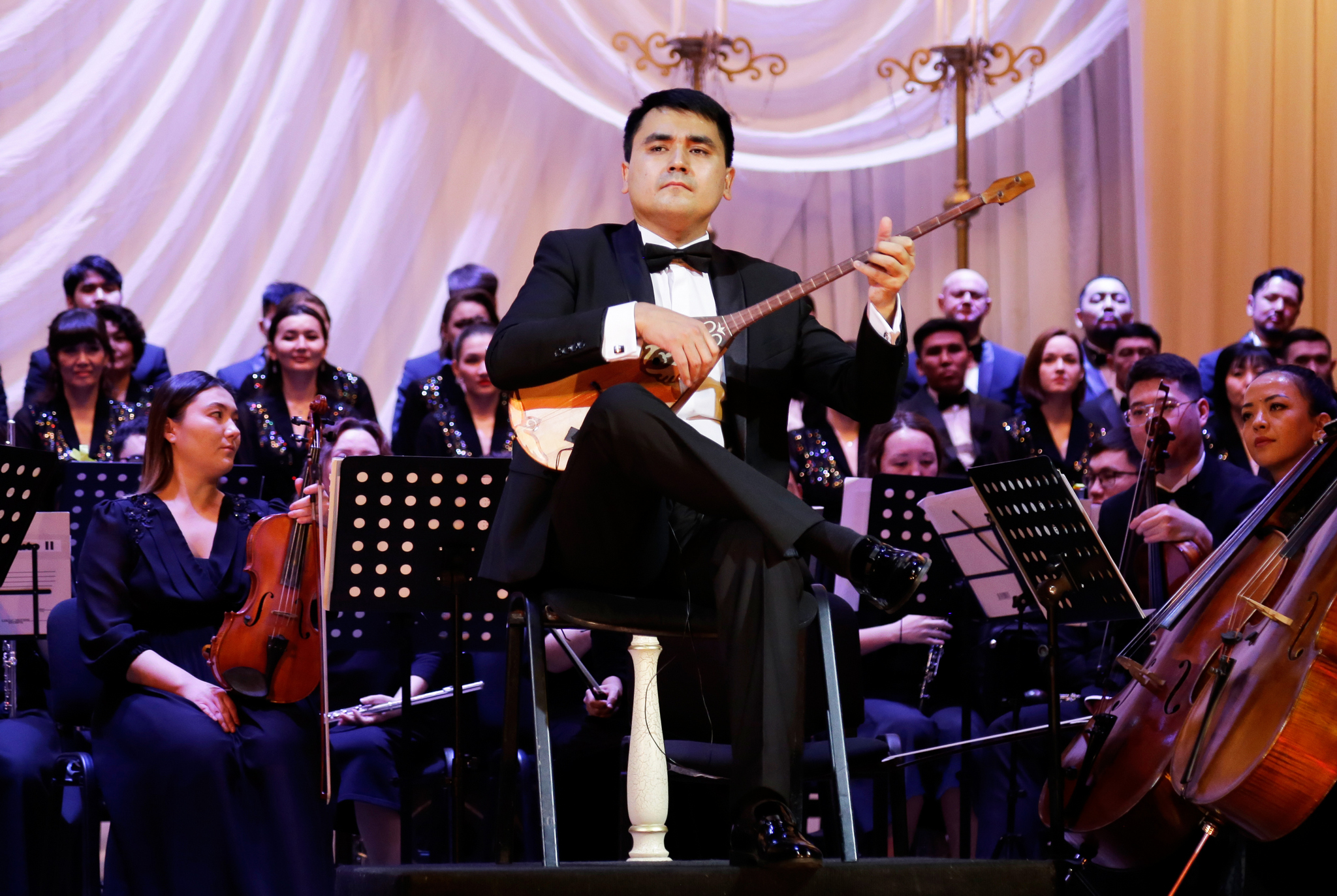 В этот вечер Руслан Баймурзин не только дирижировал оркестром, но и выступил в качестве солиста, исполнив на домбре произведение «Әлқисса» Нургисы Тлендиева.