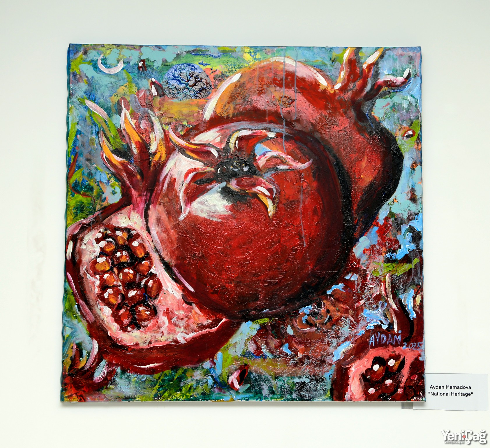 В экспозиции представлены работы азербайджанской художницы Айдан Мамедовой, которая в своих картинах использует образ граната – одного из символов Азербайджана, олицетворяющего красоту, жизнь, силу, плодородие, изобилие, которого нередко называют королем фруктов.