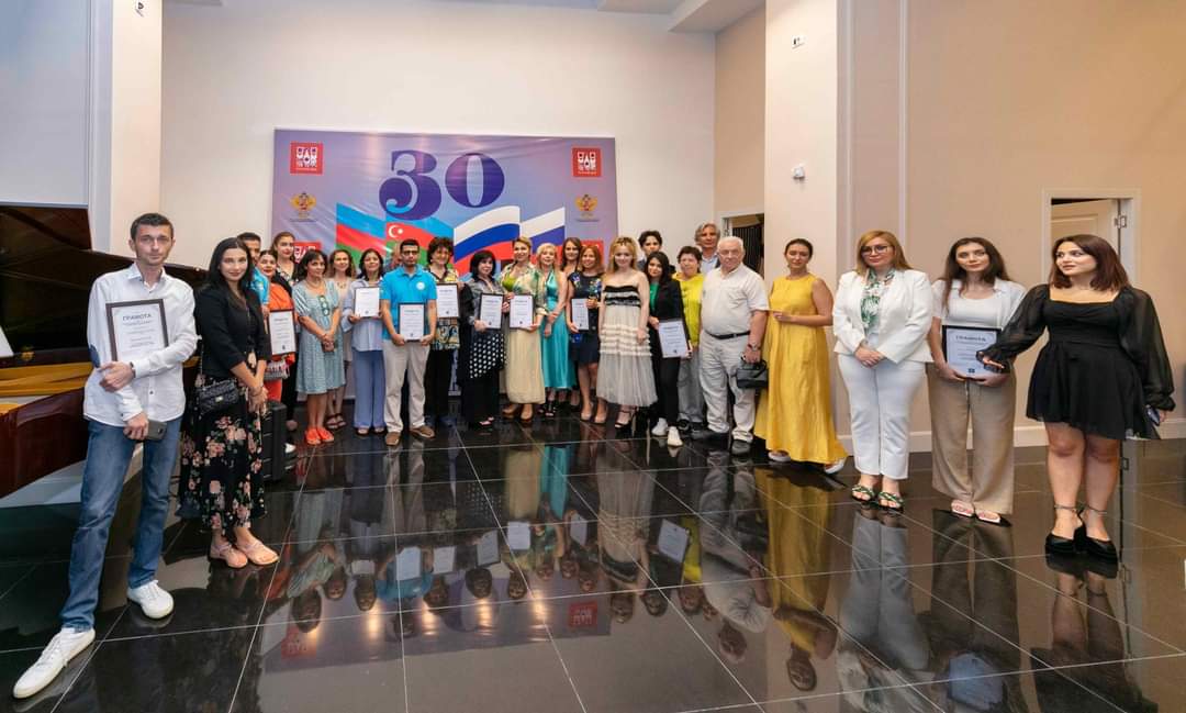 Руководитель Русского дома Ирек Зиннуров, пресс-секретарь Посольства России в Азербайджане Алина Золотарева и Постоянный представитель Татарстана в Азербайджане Мурад Гадыльшин вручили журналистам почетные грамоты за сотрудничество в информационной сфере.
